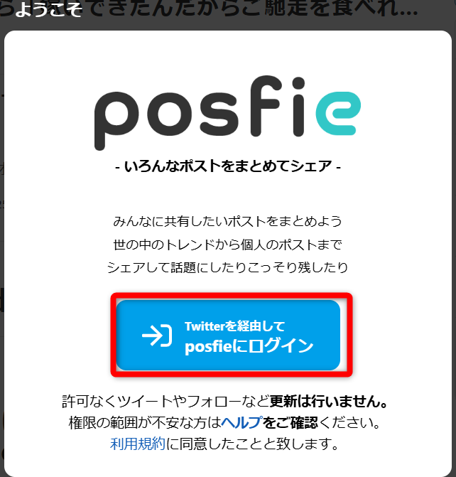 3. 青いボタン Twitterを経由してposfieにログイン を押す