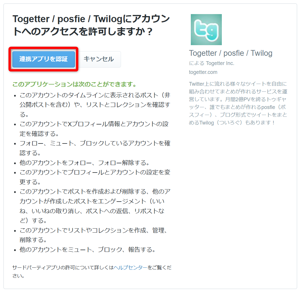 ここで「許可」画面に進むだけで、勝手に投稿されるわけではありません。